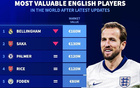 英格兰球员身价榜:贝林第一萨卡第二,赖斯、帕尔默并列第三